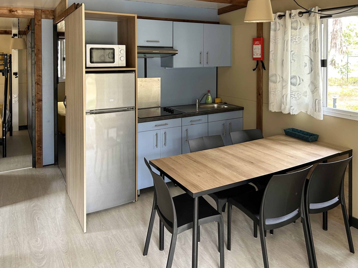 Para 3 – 5 personas. Amplio. Consta de 2 habitaciones, una con cama de matrimonio, otra con litera y una cama individual. Kitchenette con placa de inducción, frigorífico con congelador y microondas. Cuarto de baño con ducha.